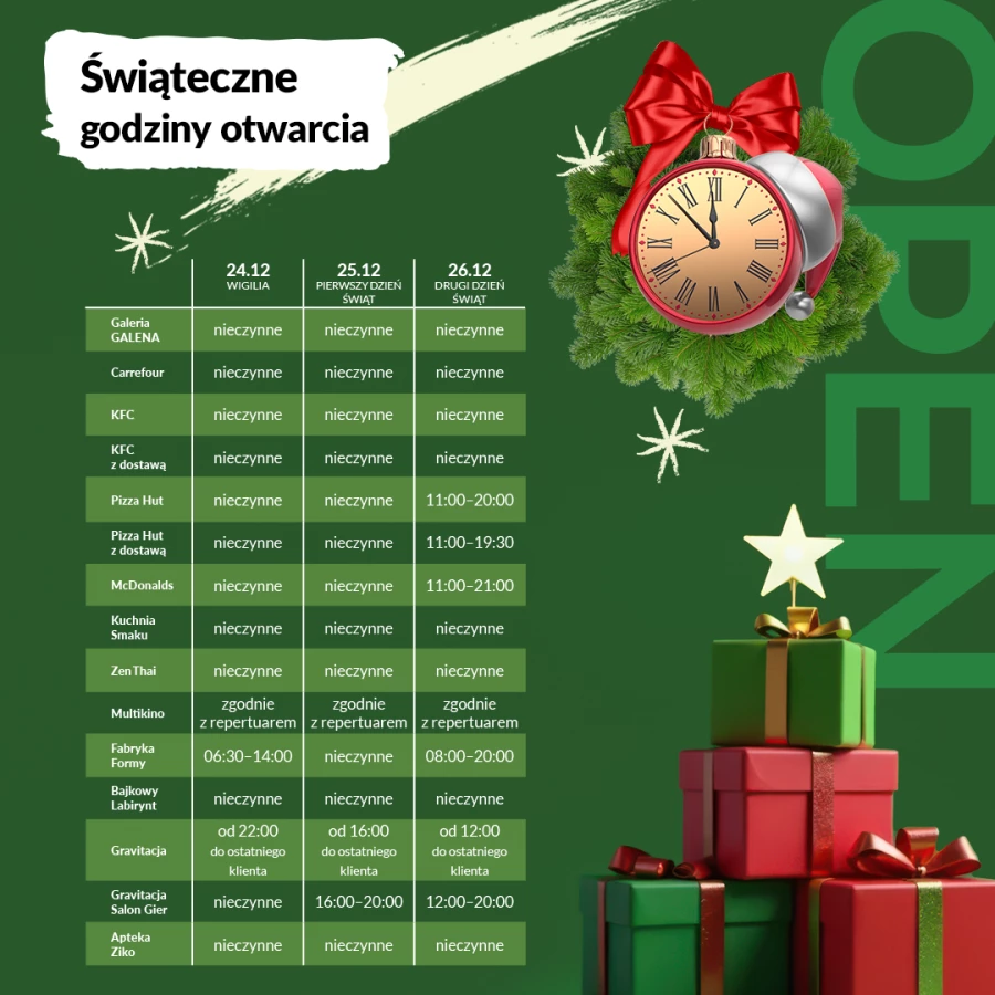 Przed nami świąteczne dni Bożego Narodzenia, zatem sklepy Galerii Galena będą nieczynne, a punkty gastronomiczne i usługowe będą funkcjonować wg określonego harmonogramu.