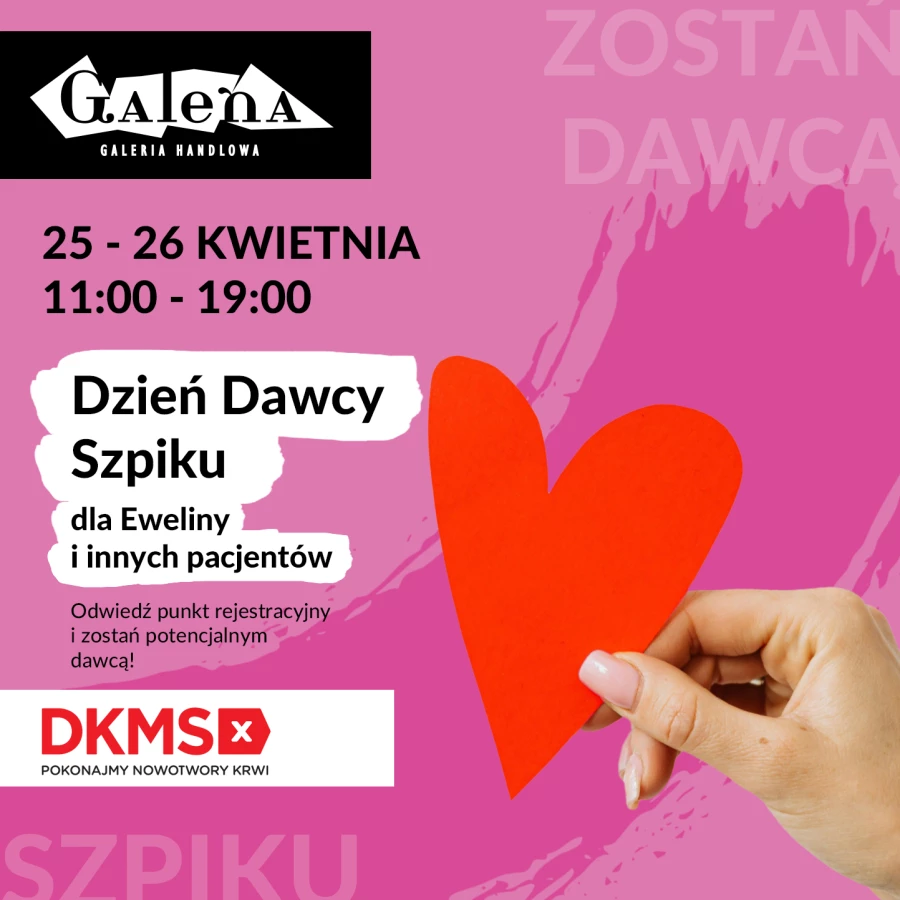 Zapraszamy Was serdecznie na akcję Fundacji DKMS „Dzień Dawcy Szpiku dla Eweliny i innych Pacjentów”, która odbędzie się w naszym centrum handlowym. Każdego dnia wielu pacjentów czeka na swojego bliźniaka genetycznego - osobę, która da im szansę na powrót do zdrowia i normalnego życia. Taką osobą jest Ewelina, 39-latka z Jaworzna, która kilka tygodni temu dowiedziała się, że aby wrócić do zdrowia będzie potrzebowała przeszczepienia szpiku.