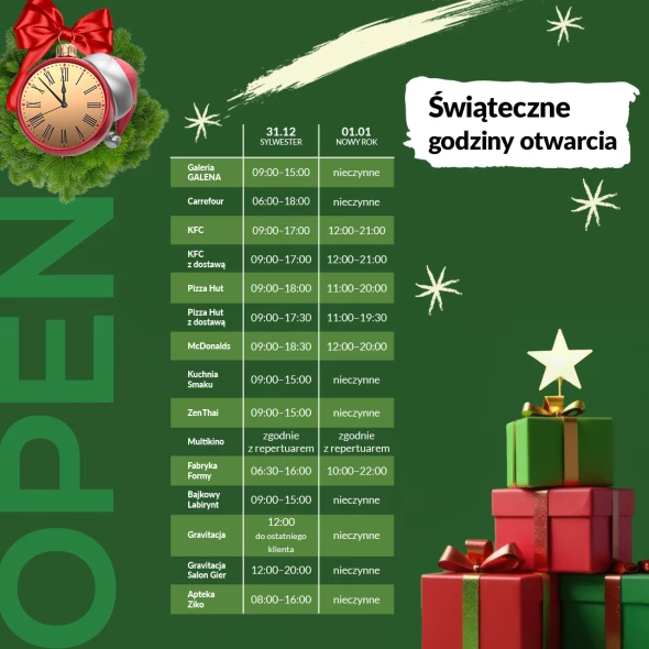 Z kolei w Nowy Rok sklepy Galerii Galena będą nieczynne. Zapraszamy jednak do odwiedzenia lokali, które tego dnia pozostaną dla Was otwarte. Sprawdźcie godziny ich funkcjonowania.