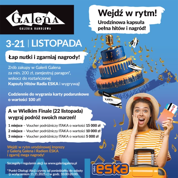 Od 3 do 21 listopada świętujemy urodziny Galerii Galena w wyjątkowym stylu! Czeka na Was pełna emocji zabawa z Kapsułą Hitów Radia ESKA, codzienne nagrody oraz wielki finał z podróżami marzeń do wygrania!