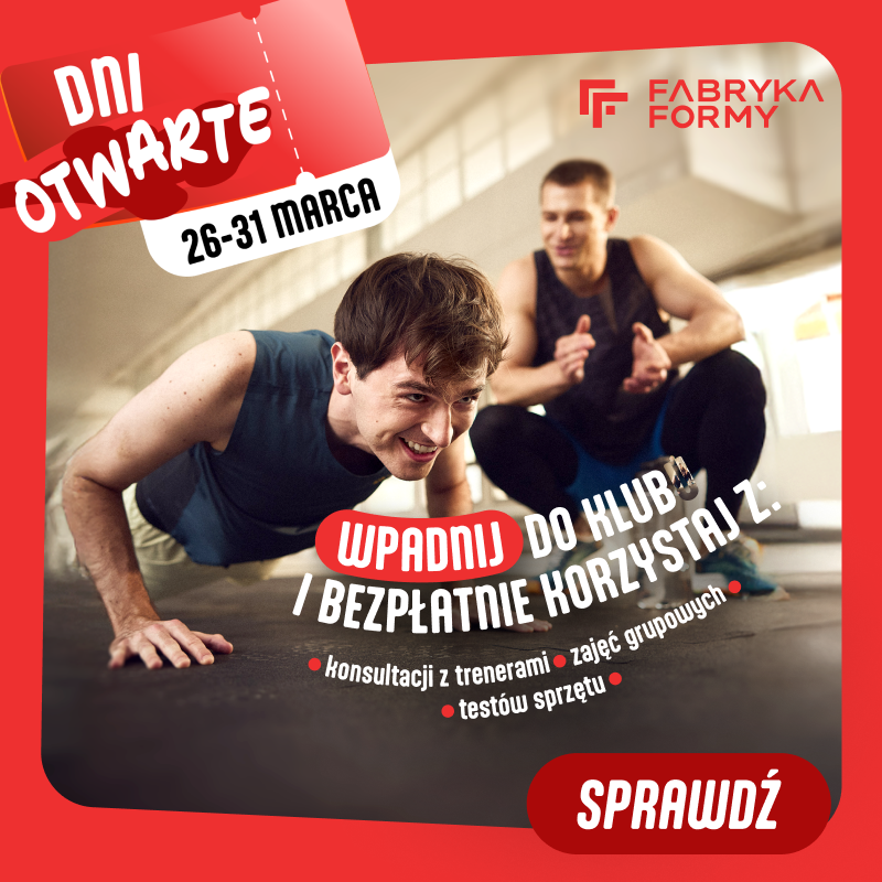 Chcesz sprawdzić, jak trenuje się w Fabryce Formy? Teraz masz idealną okazję! W dniach 26–31.03.2026 r. zapraszamy na jednorazowe, bezpłatne wejście do naszego klubu!