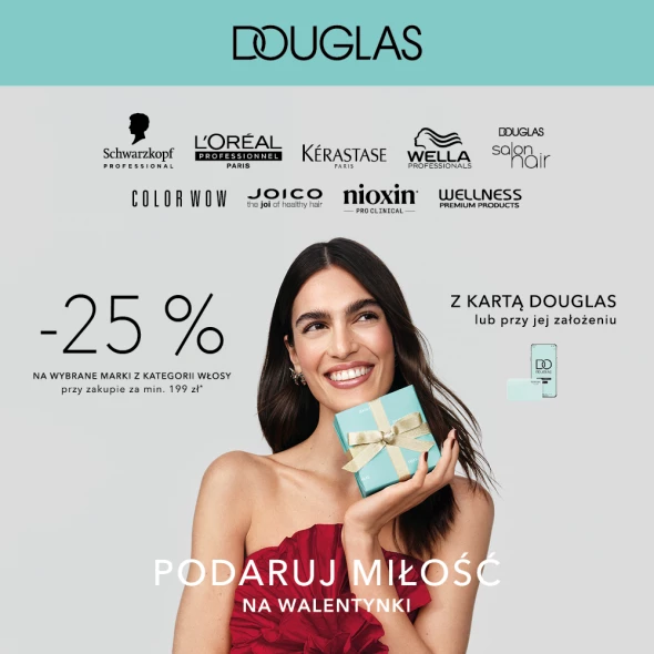 Teraz z kartą Douglas lub przy jej założeniu skorzystaj z -25%* na wybrane marki z kategorii włosy przy zakupie produktów za min. 199 zł. Odkryj kosmetyki, w których naprawdę się zakochasz. Oferta obowiązuje w perfumeriach stacjonarnych w dniach 11-14.02.2026 roku.