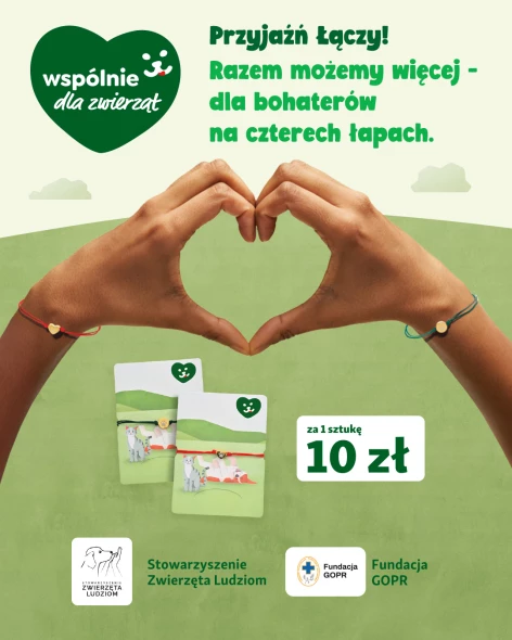 Kupując przygotowaną w ramach XI edycji akcji "Przyjaźń Łączy – Wspólnie dla Zwierząt" bransoletkę, dołożysz swoją cegiełkę do szkolenia i opieki nad psami Fundacji GOPR oraz Stowarzyszenia Zwierzęta Ludziom.