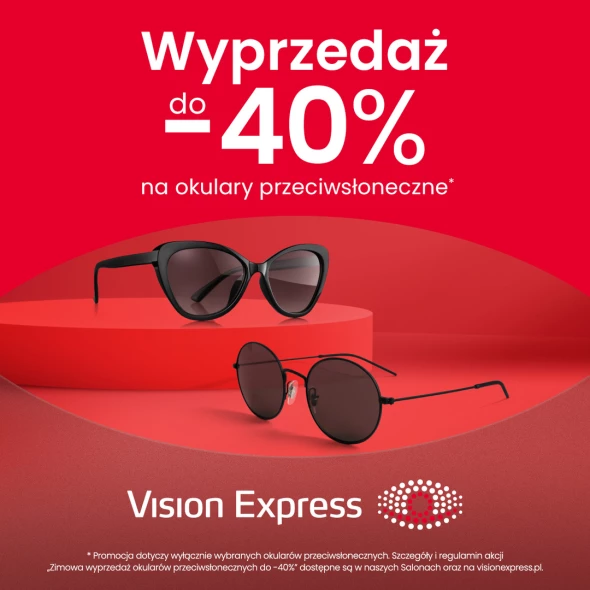 * Promocja dotyczy wyłącznie wybranych okularów przeciwsłonecznych. Szczegóły i regulamin akcji „Zimowa wyprzedaż okularów przeciwsłonecznych do -40%” dostępne są w naszych Salonach oraz na visionexpress.pl.